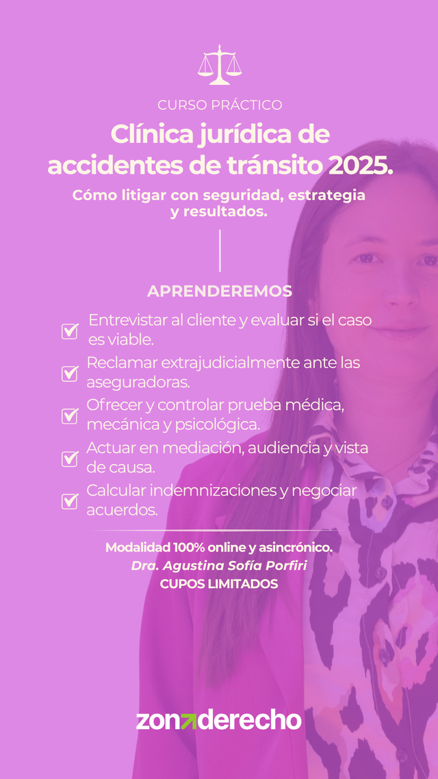 Curso integral 100% online y asincrónico para abogadas y abogados que buscan herramientas reales para litigar casos de accidentes de tránsito. Desde la entrevista inicial hasta la sentencia y el cobro. Con modelos descargables, foro de consultas y certificación oficial.